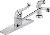 Details: This Classic Single-Handle Kitchen Faucet with Side Sprayer and Fittings in Chrome is designed to allow easy adjustments to water flow and temperature. The mid-arc spout gives you ample room for pots and pans while the color-matched side sprayer can be used to wash vegetables, as well as help keep the sink clean. Practical and hardworking, this series withstands the test of time. You can install with confidence, knowing that Delta kitchen faucets are backed by our Lifetime Limited Warranty.